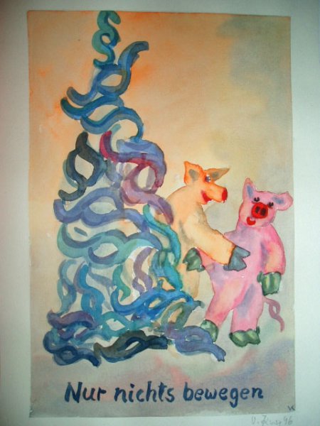 Am besten lacht es sich über andere. Der Jurist Volker Kurz hat jedoch mit seinen Cartoons den eigenen Berufsstand aufs Korn genommen. Darsteller der aquarellierten Geschichten sind Schweine, deren Kringel Schwanz sich zu einem Parapraphen umgeformt hat. Mit dieser Mutation kam zum Menschlichem im Schwein das Juristische hinzu. Ca. 500 Aquarell sind im Laufe von 6 Jahren entstanden, ebenso Drucke.